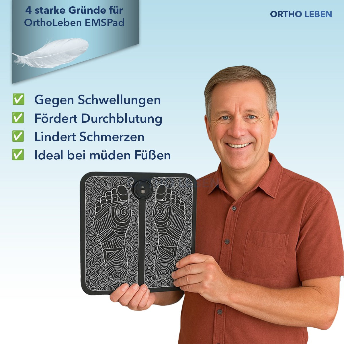 Mit dem OrthoLeben EMSPad erhalten Sie ein innovatives Therapiegerät für zu Hause, das die Ursache vieler Fußbeschwerden gezielt angeht – ganz ohne Medikamente oder Arztbesuch.