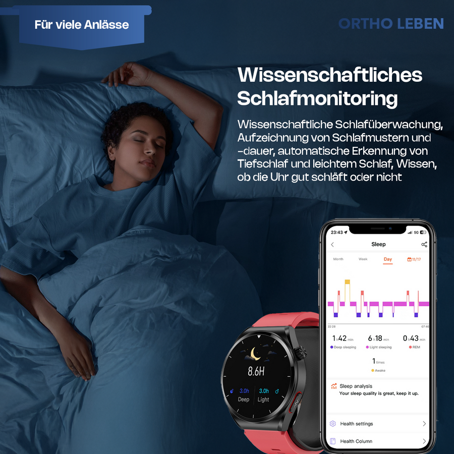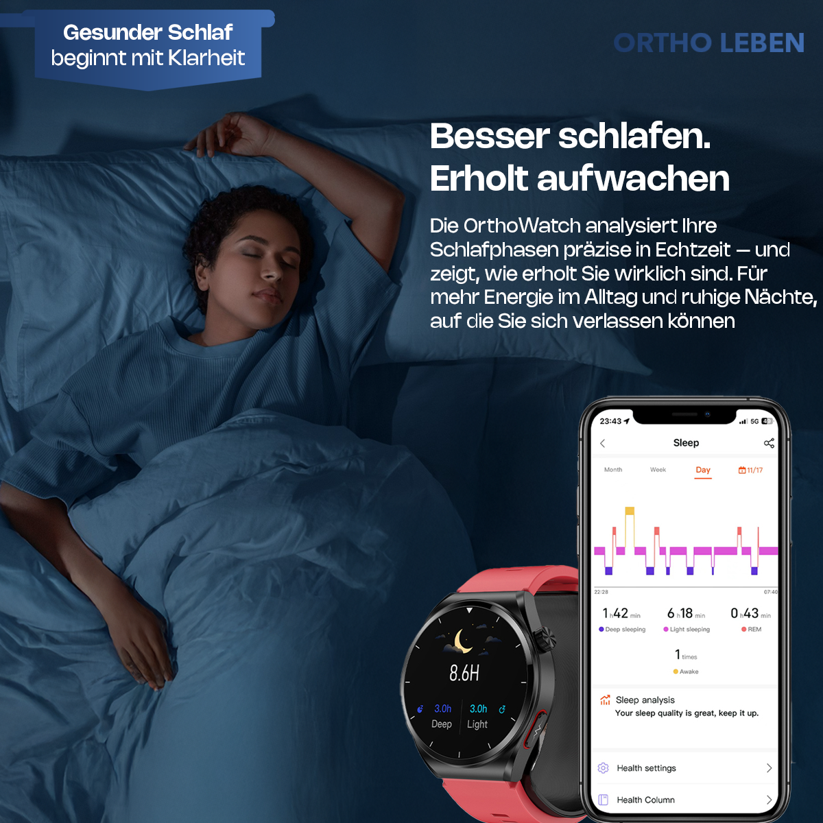 Ihr Schlaf entscheidet über Ihr Wohlbefinden – deshalb misst die OrthoWatch Cura nicht nur, wie lange Sie schlafen, sondern auch, wie gut.