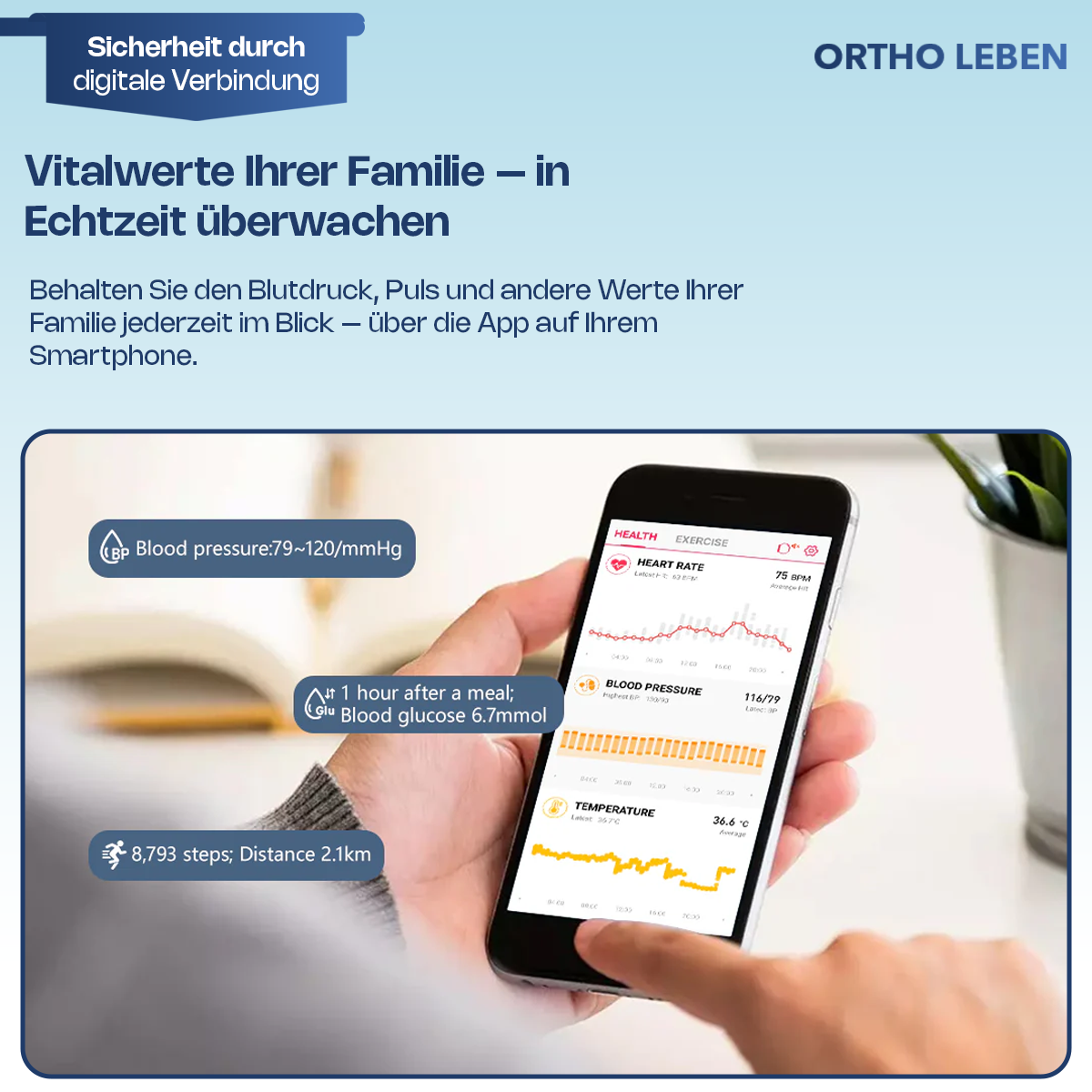 Mit der Fernpflegefunktion können Angehörige oder Pflegekräfte die Werte sicher einsehen – live oder rückblickend.