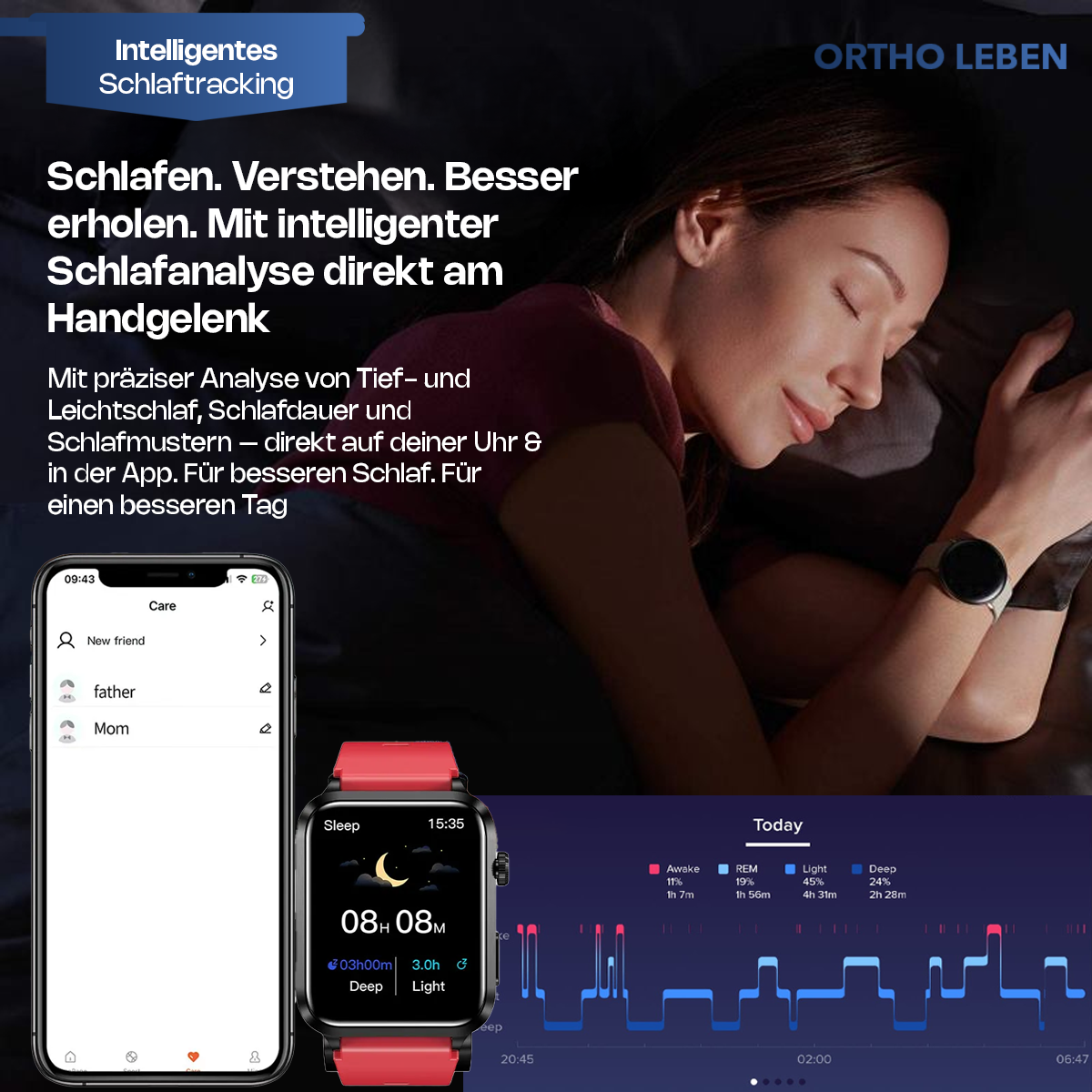 Die Orthowatch Vita One analysiert nicht nur Ihre Schlafphasen – sie erkennt Temperaturveränderungen, Atemfrequenz und Herzaktivität in der Nacht.