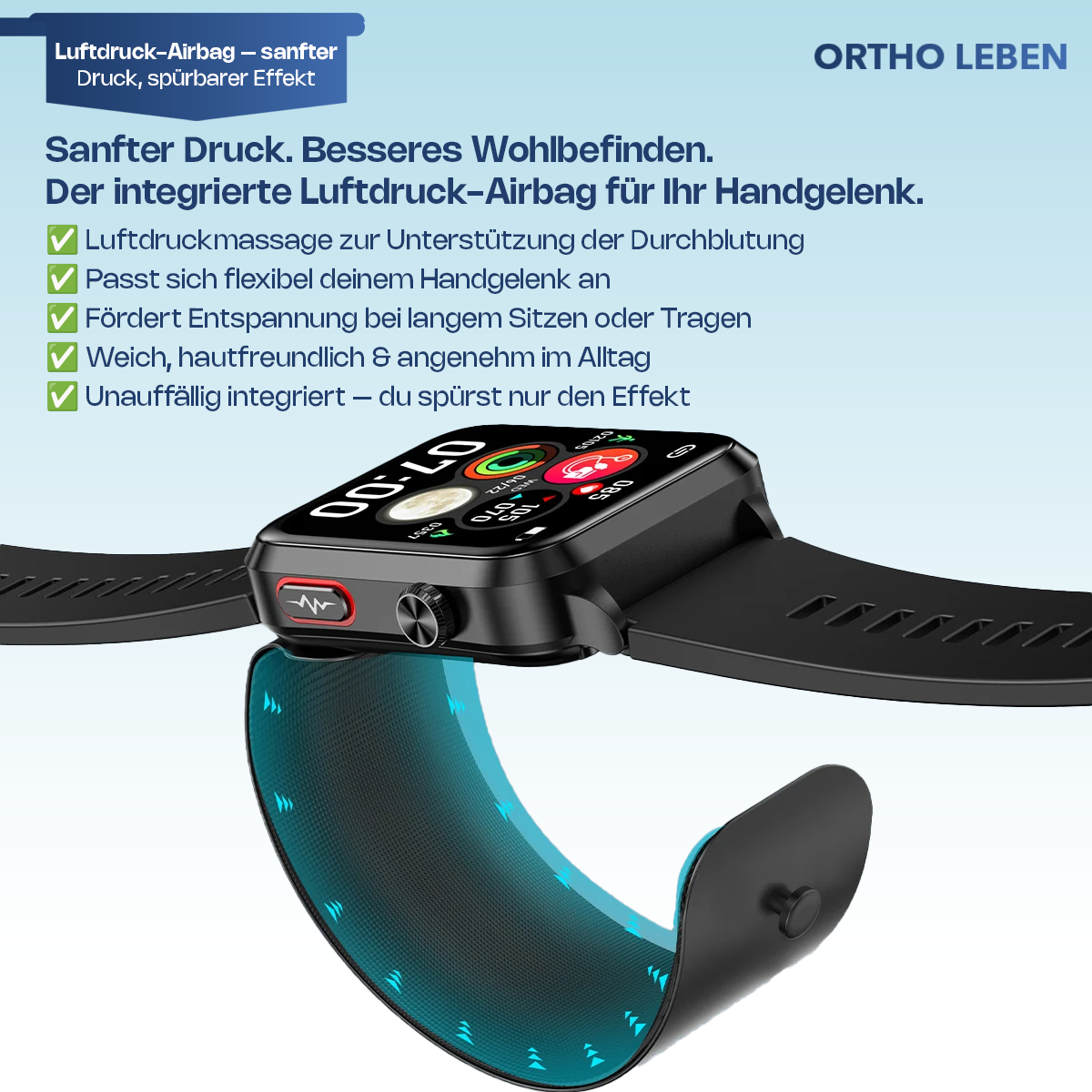 Der ultradünne TPU-Airbag im Armband fördert die Durchblutung durch sanften Druck.
