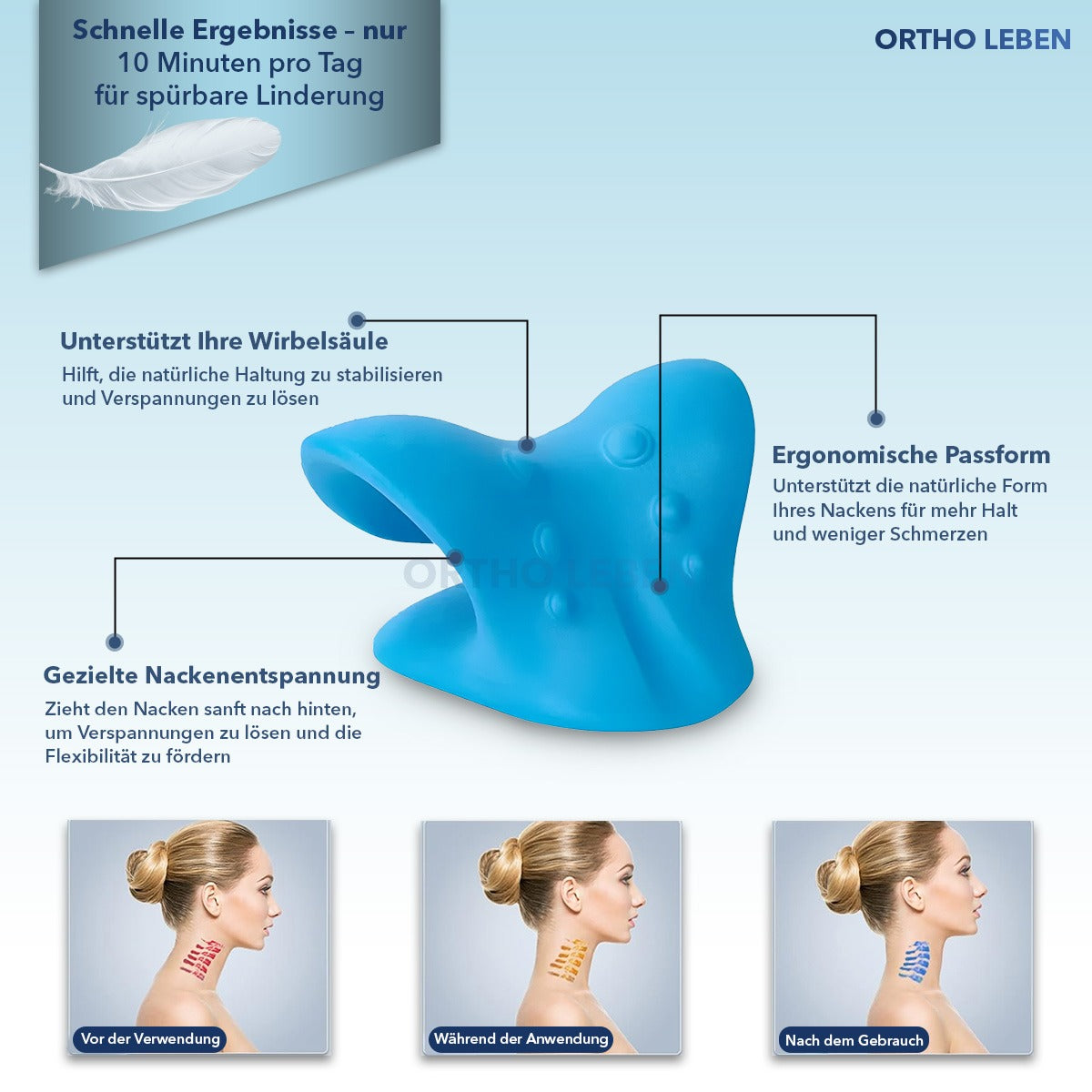 Jeder Nacken ist unterschiedlich. Deshalb ist der OrthoLeben Nackendehner so konzipiert, dass Sie Intensität und Dauer der Anwendung selbst bestimmen – ganz ohne Einstellungen oder Kraftaufwand.
