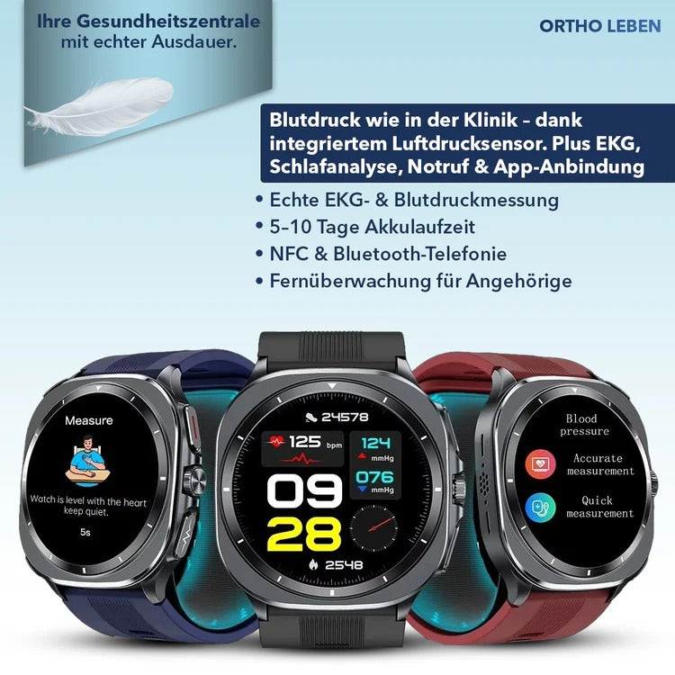 Die OrthoWatch Pro Vita zeigt dir deine wichtigsten Körperwerte in Echtzeit – Blutdruck, EKG, Sauerstoff & Harnsäure. So erkennst du Veränderungen frühzeitig und fühlst dich im Alltag sicherer.